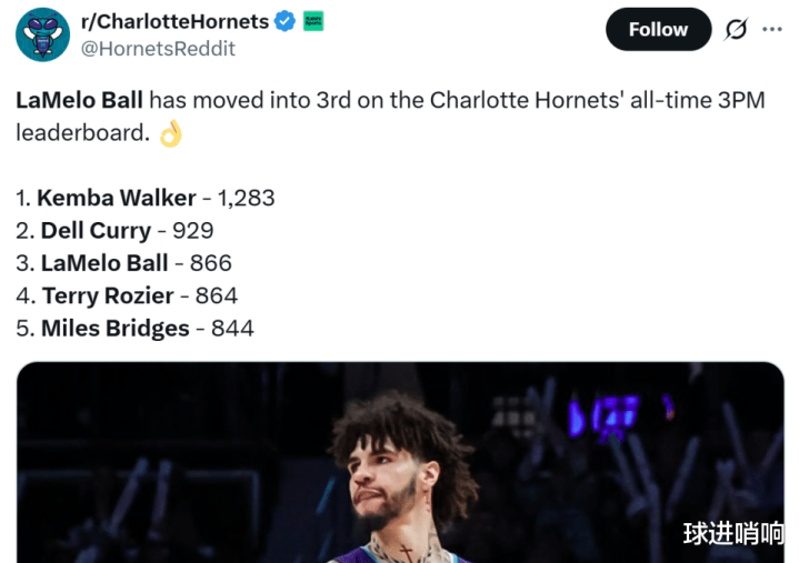 这让三球生存三分掷中数来到873记,高出罗王人尔的864记升至黄蜂队史第三,仅次于肯巴沃克(1283)和戴尔-库里(929)。