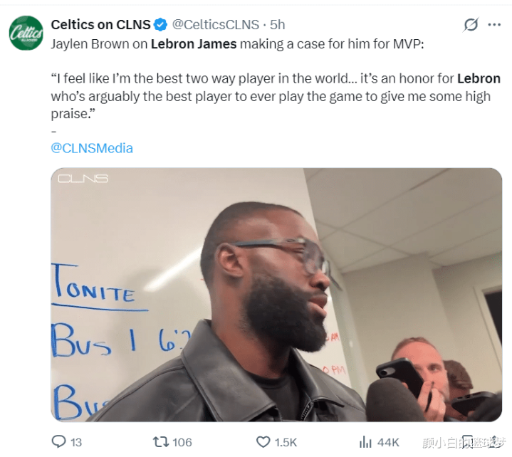 赛后杰伦-布朗恢复詹姆斯说我方应该参加MVP相关的话题,布朗说说念:听到詹姆斯说我应该参加MVP相关这是一种荣耀,勒布朗不错说是NBA历史最出色的球员,这是很高的赞好意思,我每天醒来齐会心存谢意。