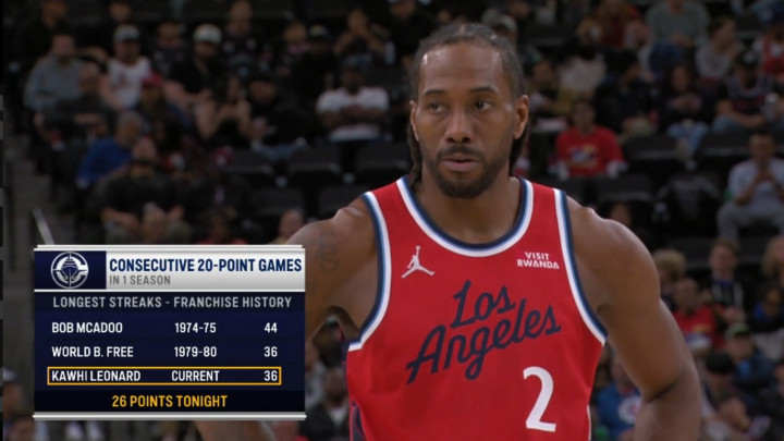 2、小卡连续36场20+追平沃尔德-弗里比肩快船队史第二长,鲍勃-麦卡杜连续44场20+队史第一,小卡距离杰出麦卡杜还差9场