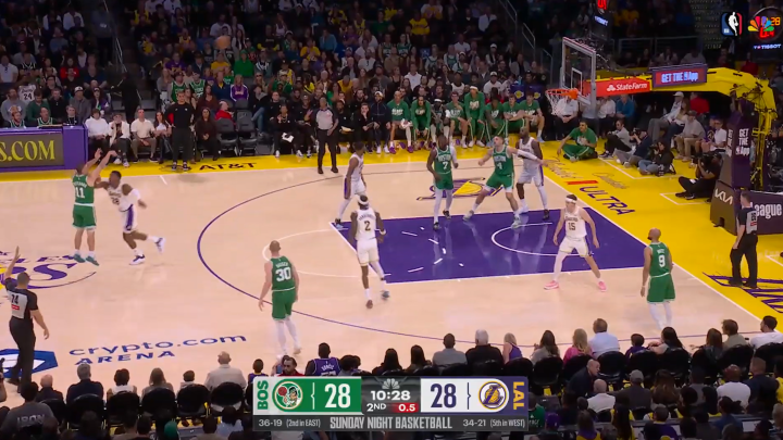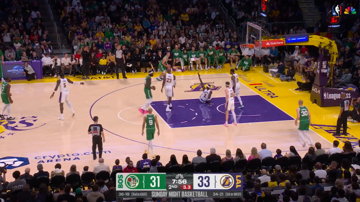 第四节剩下3分钟的一球,凯尔特东谈主102-83特出湖东谈主19分,输赢悬念仍是不大,普里查德45度对上里夫斯,全队拉开,然后普里查德连结胯下衔尾后撤步三分,球进同期,也把湖东谈主主力打到了替补席。