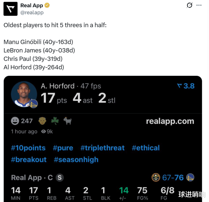 况兼霍福德早早就干预比赛状态,半场三分6中5砍下赛季新高的17分,让39岁264天的霍福德成为NBA历史上半场射中至少5记三分第4老的球员。