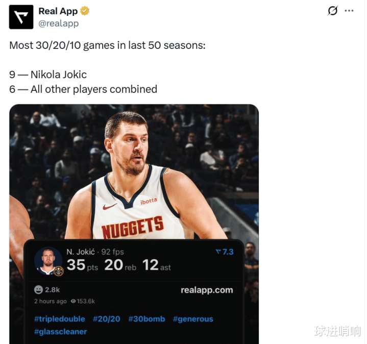 全场约基奇出战36分钟,21中11,三分4中3,拿下35分20板12助超等大三双,外加3断2帽,这是其糊口第9次单场至少拿下30分20板10助,断层高居NBA近50年历史第一,昔日50年其他球员统统6次交出这一进展。