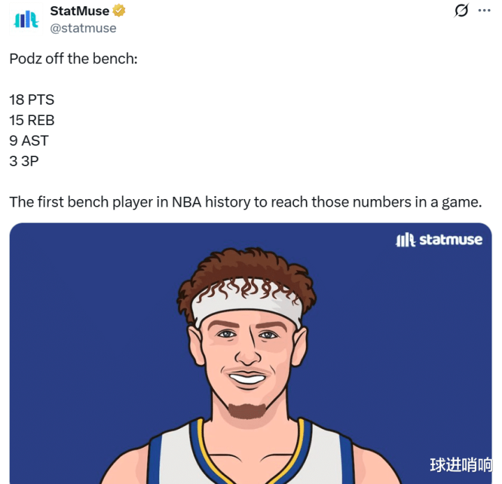凭借这么的进展,波杰成为NBA历史上首位单场拿到至少18分15板9助3三分的替补球员。
