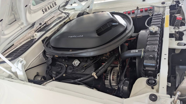 走近这台车,便能感受到Mopar经典的极致魔力:引擎盖上的Shaker进气套件高高凸起,默契那颗装着玄色褶皱气门室盖的426 Hemi,这是'Cuda的瑰丽性贪图,亦然深广Mopar粉丝心中“最好意思的引擎姿色”;车内保留了原厂悉数成立,包括带麦克风和卡带灌音机的R26 AM收音机,这份原汁原味的复旧感,让它在无边建造车中脱颖而出。惟一的“非原厂改换”,是加装了71款'Cuda的瑰丽性Billboard拉花,这份贴合车型的经典改装,既未破裂原厂质感,又让车身更具辨识度,成为建造中的点睛之笔。
