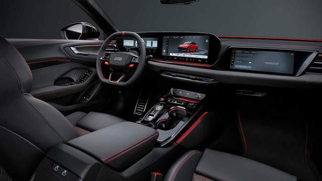 从侧后方朝上来看,除了车辆自己的第二代数字OLED尾灯外,车辆更多套件在后向、侧向皆产生了一定宽体着力。像侧身上,车辆就领有独处通顺侧裙与防刮蹭条;而前侧翼子板则有前制动系统的冷却散热孔,皆在为动态性能作念准备。更醒假想是,尾箱盖上出现了小尺寸独处尾翼,此后保障杠中不仅有纤维纹理遮拦的通顺包围,更提供了立刀式扩散器与超大号的双边共两出排气管,后者相对居中的布局形态,会让东谈主联念念到一些经典的中置布局跑车,既要性能上的增强,也要视觉上的夸张,这倒是跟奥迪长久以来的低调蹊径有了一些较着区别,个性度完成了一次关节爬升。