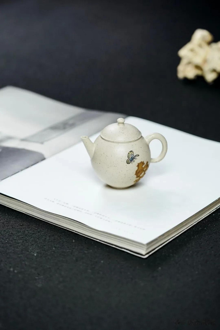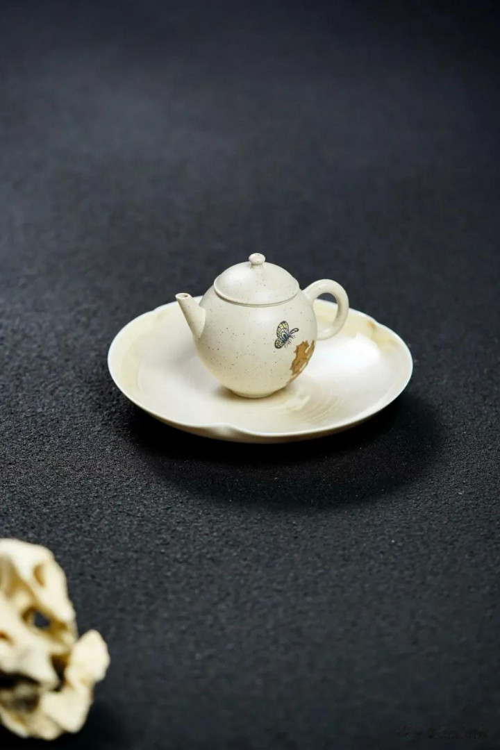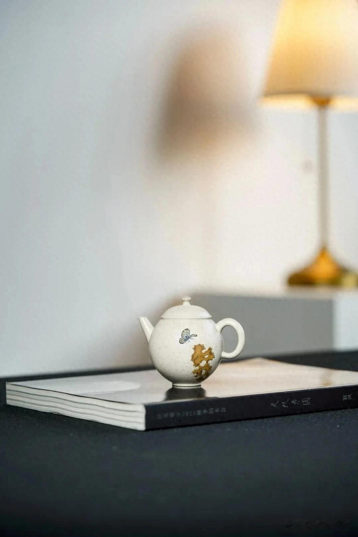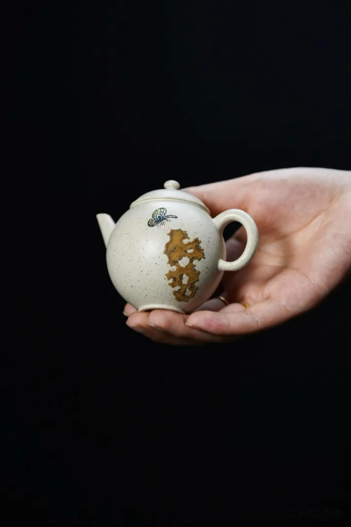 你烫壶温杯,投茶注水,看茶汤在100cc的空间里逐渐晕开。壶面上的太湖石闲适伫立,蝴蝶像是也被茶气暖到了,微微振翅。