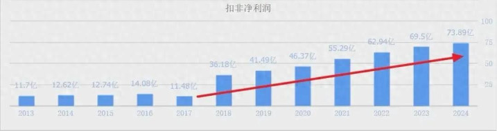 国电南瑞是特高压二次设备的完好意思大哥。看它扣非净利润,从2013年11.7亿一都干到2024年73.89亿,12年增长5倍多,稳得可怕。