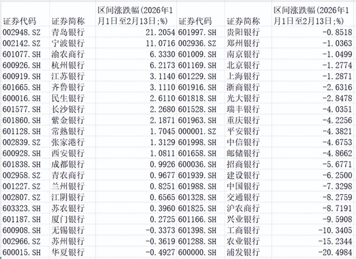 {jz:field.toptypename/}天然行业基本面有所改善,但银行股却出现较大分化:适度2026年2月13日收盘,年头以来,42家A股上市银行中有24家股价出现了下落,跌幅前四名均为国有大行及宇宙性股份制银行;涨幅前四名的银行折柳是青岛银行、宁波银行、渝农商行、杭州银行,涨幅折柳是21%、11%、6%、6%。
