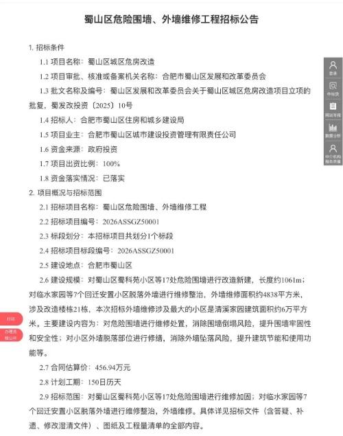 左证招标公告,该口头将对蜀山区蜀科苑小区等17处危急围墙进行雠校新建,总长度约1061米;同期对临水家园等7个回迁安置小区的零散外墙进行维修,外墙维修总面积约4838正常米,波及雠校楼栋21栋。其中,清溪家园是本次波及小区中最大的一处回迁安置小区,建筑面积约6万正常米。