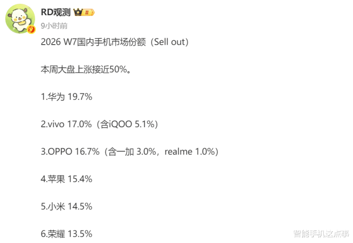 这份周报的数据,比春晚还打扰,因为近期有博主甩出2026年第7周国内手机商场份额,大盘暴涨接近50%,真是口舌常夸张。