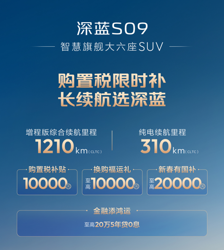 深蓝S09官方训诫售价在23.99万起,关于一台大6座大型SUV来说,这个价钱不算高,何况目下官方还提供有购置税补贴、换购福利、国补以及金融策略等,总体算下来,概述优惠能达到3万多,车子的性价比也有了大幅普及。