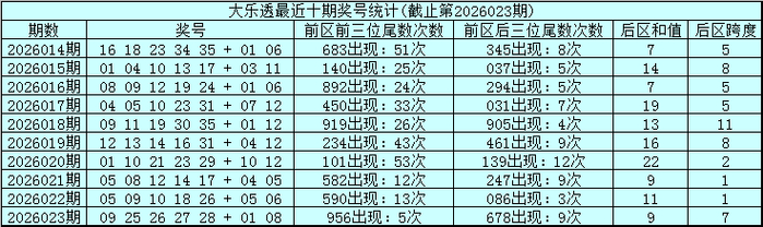体彩大乐透第26023期奖号开出:09 25 26 27 28+01 08,前区奖号大小比为4:1,012路比为2:2:1,奇偶比为3:2,后区号码和值为9,跨度为7。