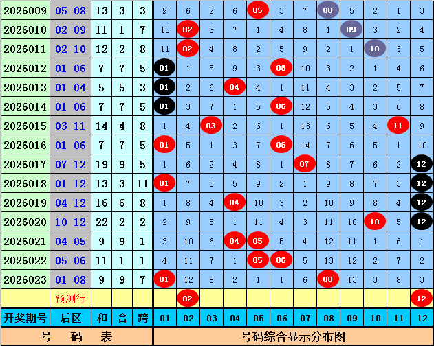 后区号码分析:上期后区开出奖号01 08,和值为9,跨度为7,本期后区参考号码02、04、06、07、12。