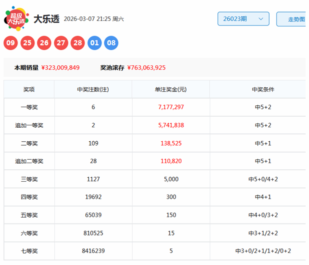 大乐透第2026023期奖号为:09、25、26、27、28+01 08,其中前区奇偶比为3:2,大小比为4:1,和值为115,后区和值为9,跨度为7。