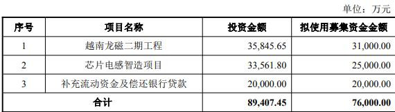 公司本次向特定对象刊行股票召募资金总数不跨越76,000.00万元(含本数),并以中国证监会对于本次刊行的注册批复文献为准。本次刊行的召募资金在扣除刊行用度后,将用于越南龙磁二期工程、芯片电感智造花式、补充流动资金及偿还银行贷款。