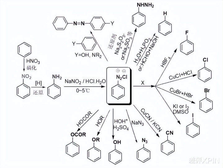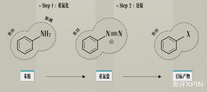 把苯胺放进去,就真的不错变成任何想要的东西 —— 溴、氯、氰、羟基,致使是氢自己,王人能装上去。
