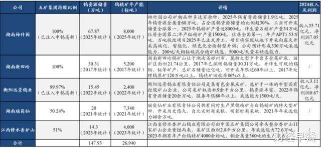 2024年,公司钨精矿产能高居国内企业首位,占国内企业钨精矿产能的20%,显赫高于厦门钨业(16%)、江钨集团(11%)等同业企业。据东吴证券,截止2025年,公司揣摸钨矿资源储量达147.93万吨,钨精矿年产能为26940标吨,资源布局全面且产能清醒。下表回首了公司咫尺旗下五大钨矿金钱情况:
