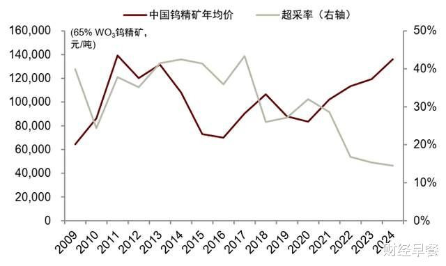 中国钨精矿年均价和超采率(2009-2024年)|图片开首:中金