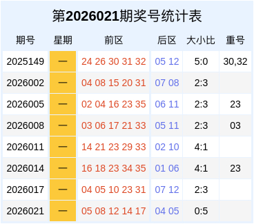 重号分析:上周一莫得开出重号,在近8期同周一的奖号数据中,开出重号的概率为50.00%,本周一权衡会开出重号:26。